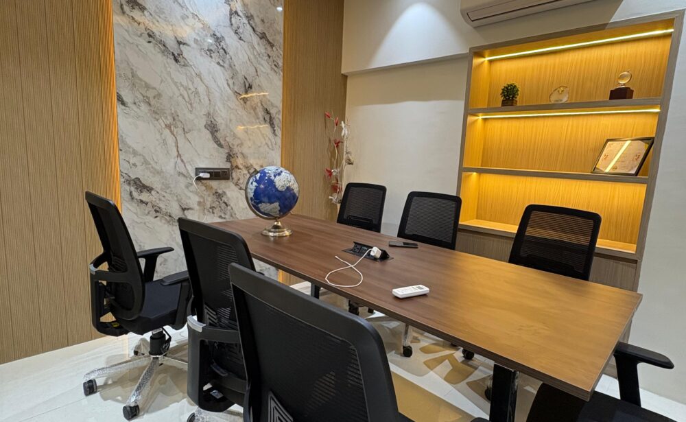 This office interior exudes a luxurious and modern vibe with its striking black marble reception desk highlighted by warm golden lighting. The geometric shelving and sleek wooden accents add depth and character, while the contemporary ceiling light enhances the overall aesthetic. A perfect blend of elegance and functionality, it creates a welcoming yet professional atmosphere.